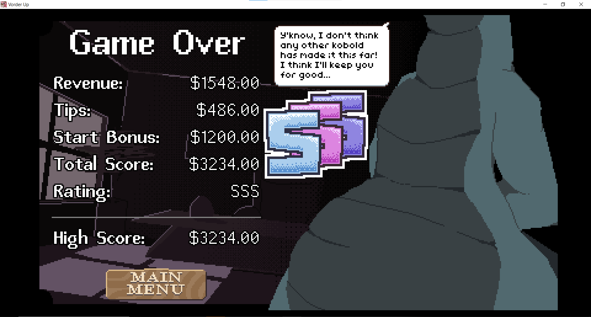 super hard to do on laptop touch pad, but still a good game. was kinda disappointed that the game over screen was the boss nommin down and not the disgruntled patron that didn't get their order.