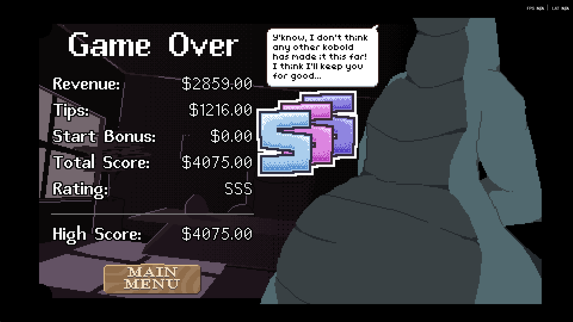 Fun game, but yikes when the HECK does Happy hour finish? I can't keep going anymore I'm bored of the puzzles being the same and nothing new happening other than score go up... Needs a story and to end days and introduce new stuff or something. Maybe something where your kobold can vore some people themselves and gets bigger and becomes a dragon to open thier own store or something, but yeh Fun game
